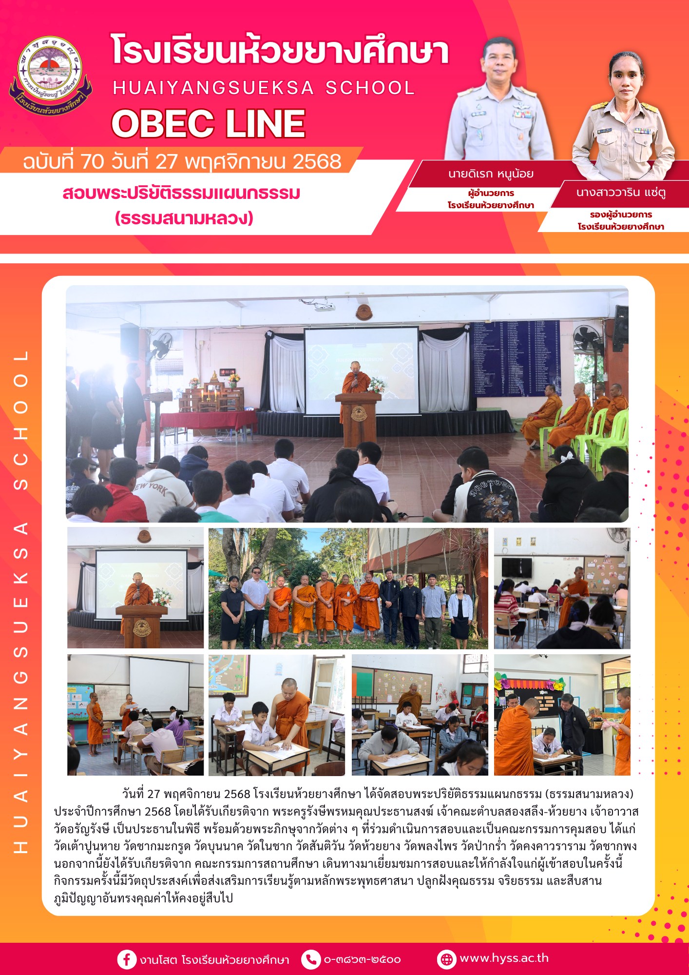 📅 วันที่ 27 พฤศจิกายน 2568 โรงเรียนห้วยยางศึกษา ได้จัดสอบ พระปริยัติธรรมแผนกธรรม (ธรรมสนามหลวง) ประจำปีการศึกษา 2568 📖🕊 โดยได้รับเกียรติจาก พระครูรังษีพรหมคุณประธานสงฆ์ เจ้าคณะตำบลสองสลึง-ห้วยยาง เจ้าอาวาสวัดอรัญรังษี เป็นประธานในพิธี พร้อมด้วยพระภิกษุจากวัดต่าง ๆ ที่ร่วมดำเนินการสอบ ได้แก่ 📍 วัดเต้าปูนหาย 📍 วัดชากมะกรูด 📍 วัดบุนนาค 📍 วัดในชาก 📍 วัดสันติวัน 📍 วัดห้วยยาง 📍 วัดพลงไพร 📍 วัดป่ากร่ำ 📍 วัดคงคาวราราม 📍 วัดชากพง นอกจากนี้ยังได้รับเกียรติจาก คณะกรรมการสถานศึกษา เดินทางมาเยี่ยมชมการสอบและให้กำลังใจแก่ผู้เข้าสอบในครั้งนี้ 🛕✨ กิจกรรมครั้งนี้มีวัตถุประสงค์เพื่อส่งเสริมการเรียนรู้ตามหลักพระพุทธศาสนา ปลูกฝังคุณธรรม จริยธรรม และสืบสานภูมิปัญญาอันทรงคุณค่าให้คงอยู่สืบไป 🙏🌿