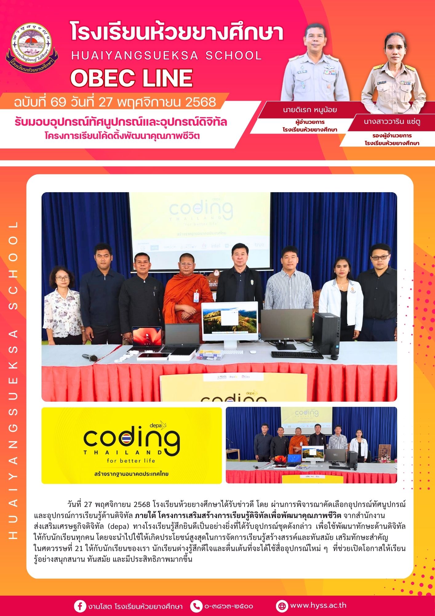 📅 วันที่ 27 พฤศจิกายน 2568 โรงเรียนห้วยยางศึกษาได้รับข่าวดี 🎉 โดย ผ่านการพิจารณาคัดเลือกอุปกรณ์ทัศนูปกรณ์และอุปกรณ์การเรียนรู้ด้านดิจิทัล ภายใต้ โครงการเสริมสร้างการเรียนรู้ดิจิทัลเพื่อพัฒนาคุณภาพชีวิต จาก สำนักงานส่งเสริมเศรษฐกิจดิจิทัล (depa) 💻📱✨ ทางโรงเรียนรู้สึกยินดีเป็นอย่างยิ่งที่ได้รับอุปกรณ์ชุดดังกล่าว เพื่อใช้พัฒนาทักษะด้านดิจิทัลให้กับนักเรียนทุกคน โดยจะนำไปใช้ให้เกิดประโยชน์สูงสุดในการจัดการเรียนรู้สร้างสรรค์และทันสมัย เสริมทักษะสำคัญในศตวรรษที่ 21 ให้กับนักเรียนของเรา 🌟👩🏫👨🎓 นักเรียนต่างรู้สึกดีใจและตื่นเต้นที่จะได้ใช้สื่ออุปกรณ์ใหม่ ๆ ที่ช่วยเปิดโอกาสให้เรียนรู้อย่างสนุกสนาน ทันสมัย และมีประสิทธิภาพมากขึ้น 🚀📚 #โรงเรียนห้วยยางศึกษา #DigitalLearning #depa #อุปกรณ์ดิจิทัลเพื่อการศึกษา #พัฒนาคุณภาพการเรียนรู้ #การศึกษายุคใหม่ #เสริมทักษะดิจิทัล #เพื่อเด็กห้วยยางศึกษา 🌈✨