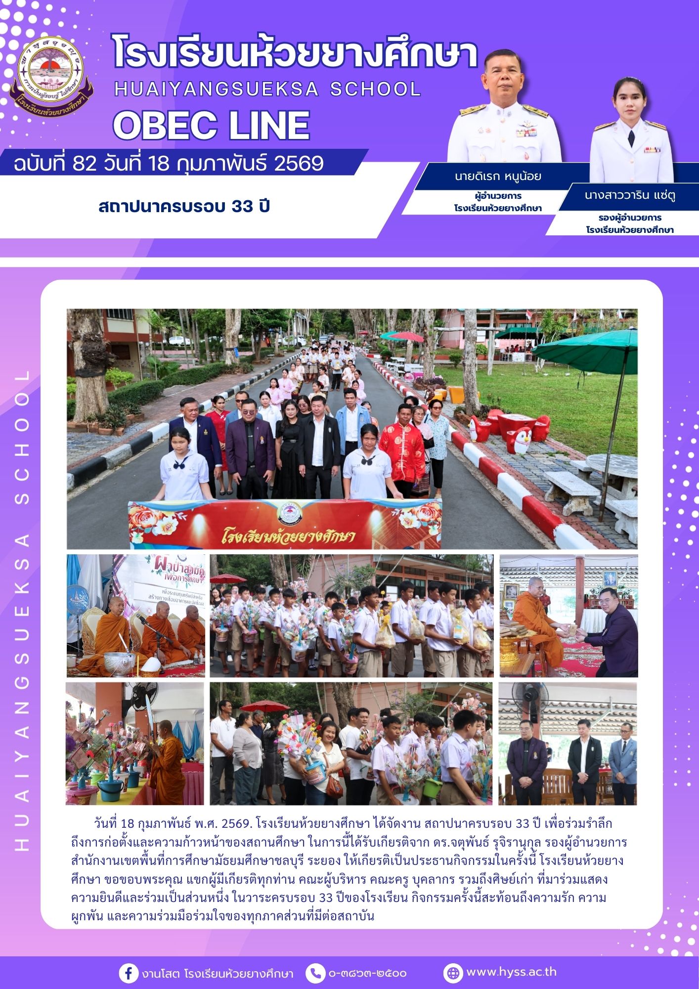 📅 วันที่ 18 กุมภาพันธ์ พ.ศ. 2569 โรงเรียนห้วยยางศึกษา ได้จัดงานสถาปนาครบรอบ 33 ปี 🎉🏫 เพื่อร่วมรำลึกถึงการก่อตั้งและความก้าวหน้าของสถานศึกษา ในการนี้ได้รับเกียรติจาก 🎖️ ดร.จตุพันธ์ รุจิรานุกุล รองผู้อำนวยการสำนักงานเขตพื้นที่การศึกษามัธยมศึกษาชลบุรี ระยอง ให้เกียรติเป็นประธานกิจกรรมในครั้งนี้ ✨ โรงเรียนห้วยยางศึกษา ขอขอบพระคุณ แขกผู้มีเกียรติทุกท่าน คณะผู้บริหาร คณะครู บุคลากร รวมถึงศิษย์เก่า ที่มาร่วมแสดงความยินดีและร่วมเป็นส่วนหนึ่ง ในวาระครบรอบ 33 ปีของโรงเรียน 💙🤝 กิจกรรมครั้งนี้สะท้อนถึงความรัก ความผูกพัน และความร่วมมือร่วมใจของทุกภาคส่วนที่มีต่อสถาบัน 🌱