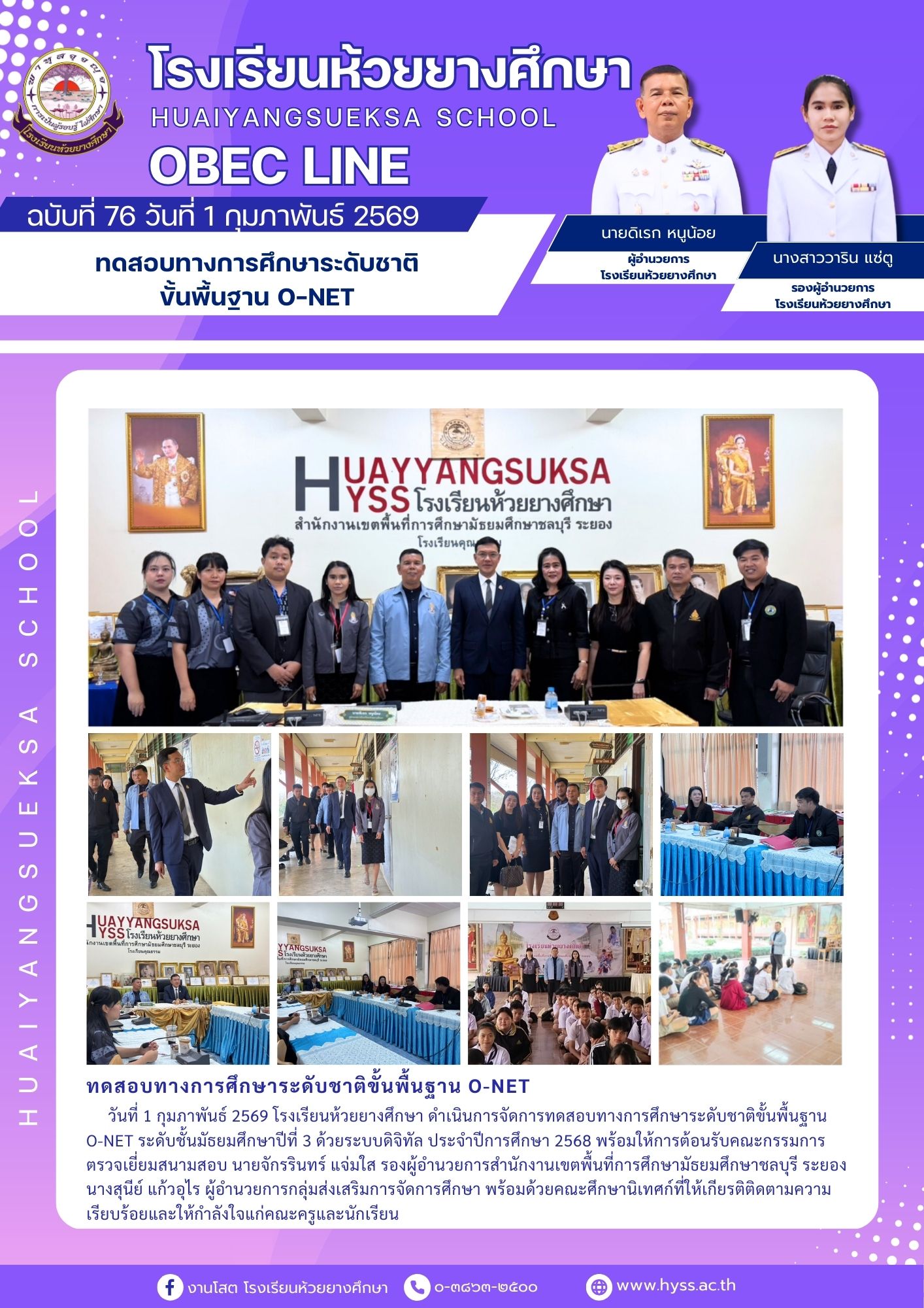 📅 วันที่ 1 กุมภาพันธ์ 2569 🏫 โรงเรียนห้วยยางศึกษา ดำเนินการจัดการทดสอบทางการศึกษาระดับชาติขั้นพื้นฐาน 📝 O-NET ระดับชั้นมัธยมศึกษาปีที่ 3 ด้วยระบบดิจิทัล ประจำปีการศึกษา 2568 💻✨ พร้อมให้การต้อนรับคณะกรรมการตรวจเยี่ยมสนามสอบ 🤝 👨💼 นายดิเรก หนูน้อย ผู้อำนวยการโรงเรียนห้วยยางศึกษา มอบหมายให้ 👩💼 นางสาววาริน แซ่ตู รองผู้อำนวยการโรงเรียนห้วยยางศึกษา ปฏิบัติหน้าที่ผู้อำนวยการสอบ ดำเนินการประชุมชี้แจงคณะกรรมการคุมสอบและบุคลากรที่เกี่ยวข้อง เพื่อให้การสอบเป็นไปอย่างถูกต้อง โปร่งใส และมีประสิทธิภาพสูงสุด ✅📊 ✨ ในโอกาสนี้ โรงเรียนห้วยยางศึกษา ขอขอบพระคุณคณะกรรมการตรวจเยี่ยมสนามสอบ นำโดย 👤 นายจักรรินทร์ แจ่มใส รองผู้อำนวยการสำนักงานเขตพื้นที่การศึกษามัธยมศึกษาชลบุรี ระยอง 👤 นางสุนีย์ แก้วอุไร ผู้อำนวยการกลุ่มส่งเสริมการจัดการศึกษา 👥 พร้อมด้วยคณะศึกษานิเทศก์ ที่ให้เกียรติติดตามความเรียบร้อยและให้กำลังใจแก่คณะครูและนักเรียน 🌟🙏